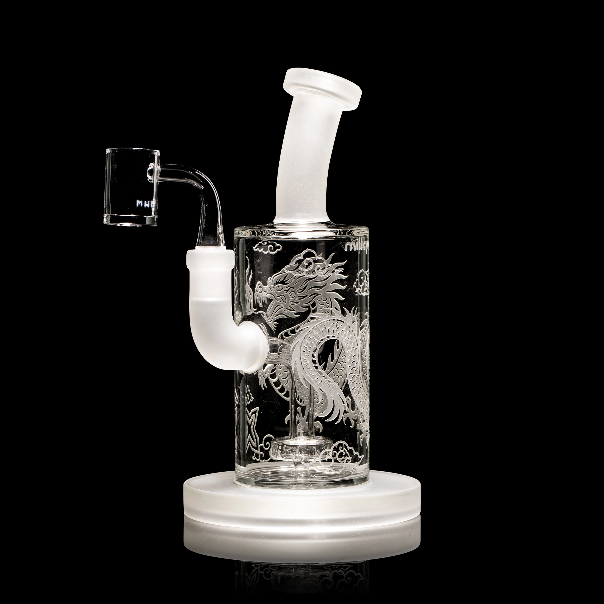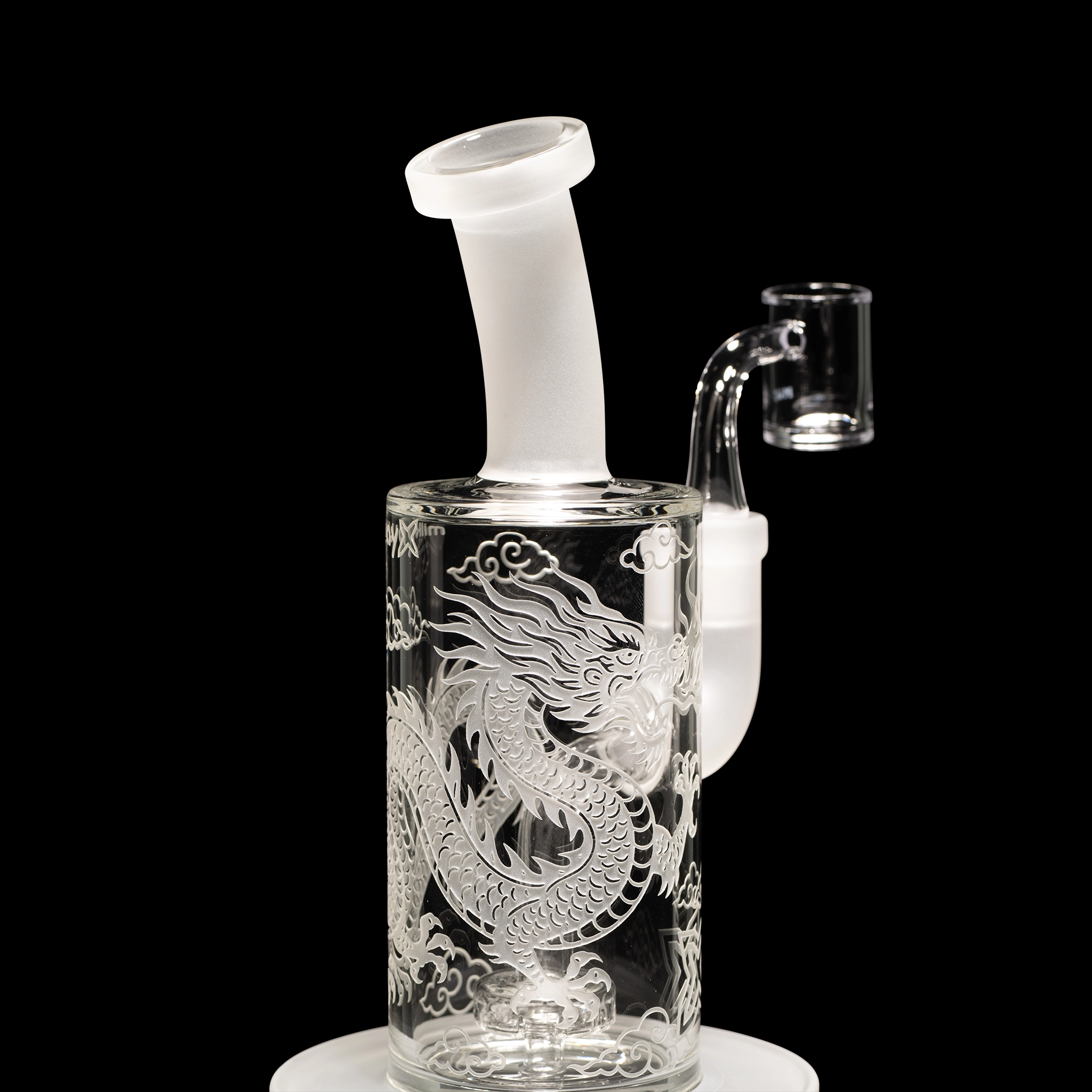 This 7” rig carries the same Dragon Heart design in a more compact form. It has a showerhead perc. Comes with a quartz banger nail.