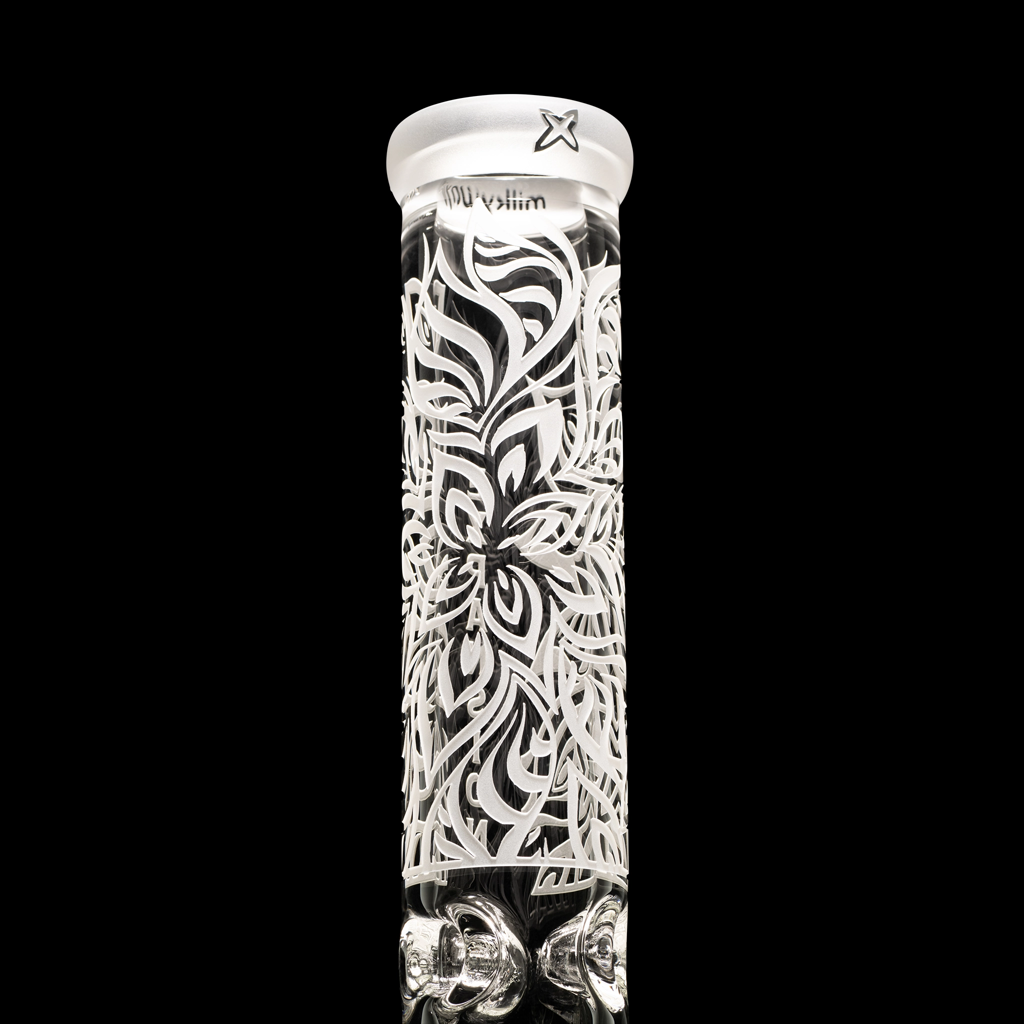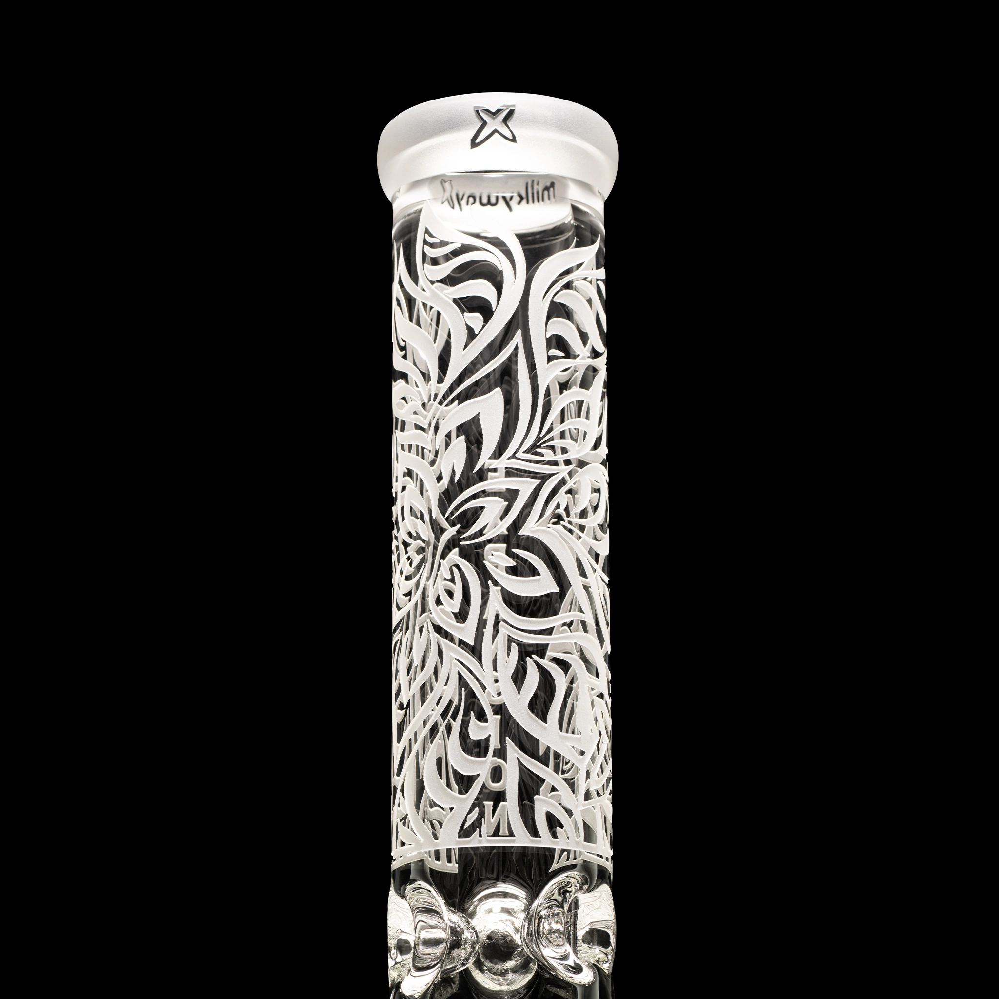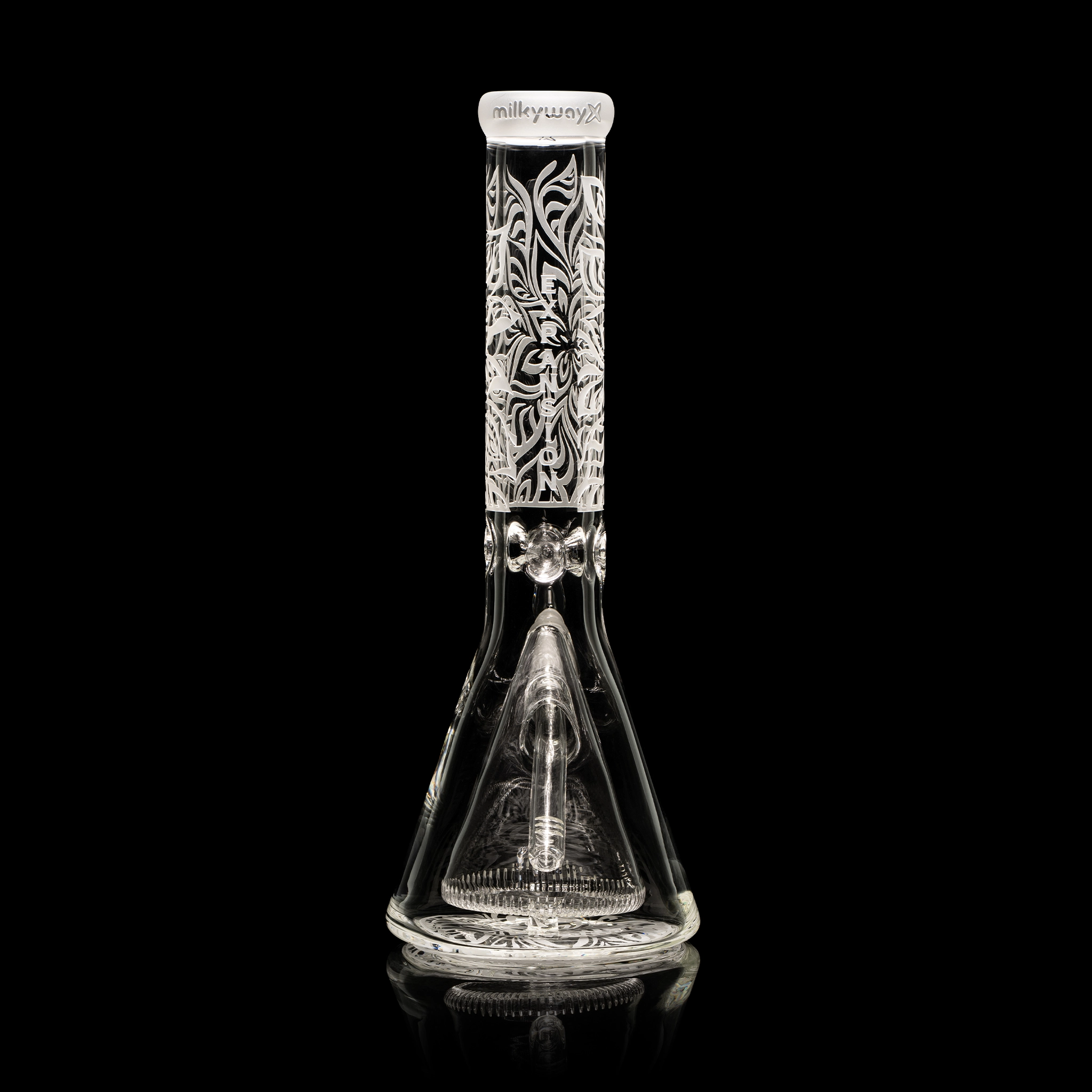 Expansion is a 14” beaker with a single-layer sandblast that pushes the limits of space and structure. The design plays with dimensional patterns and futuristic forms, set on thick, durable glass. It contains a Collins perc. Comes with a 5.5” downstem and bowl.
