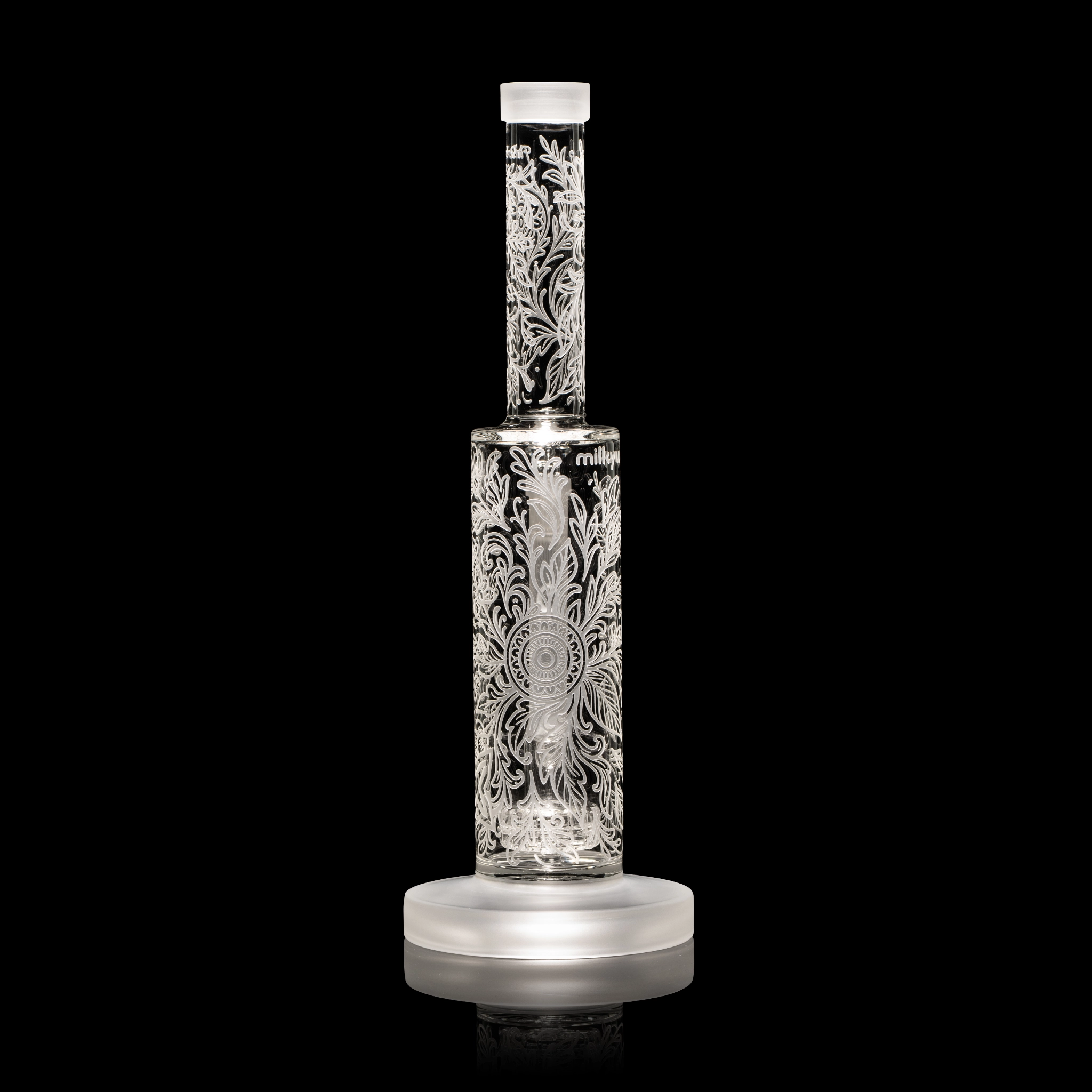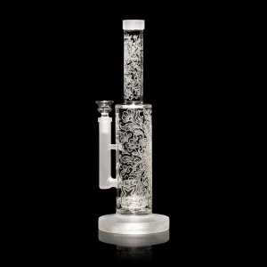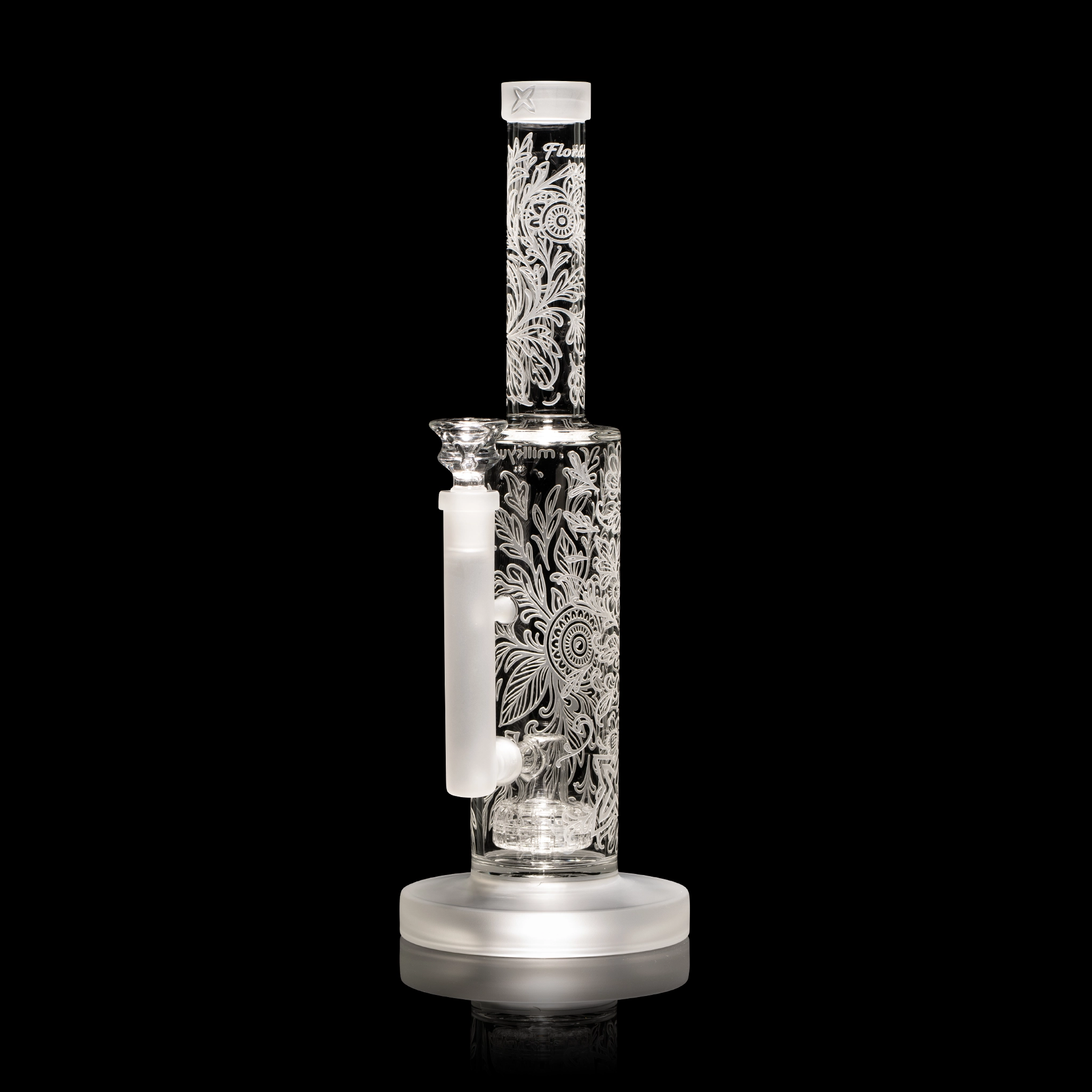 This 13” water pipe features a flowing single-layer sandblast combining floral patterns and abstract shapes. A smooth blend of nature and form, all built on thick, reliable glass. It has a Pirelli perc.