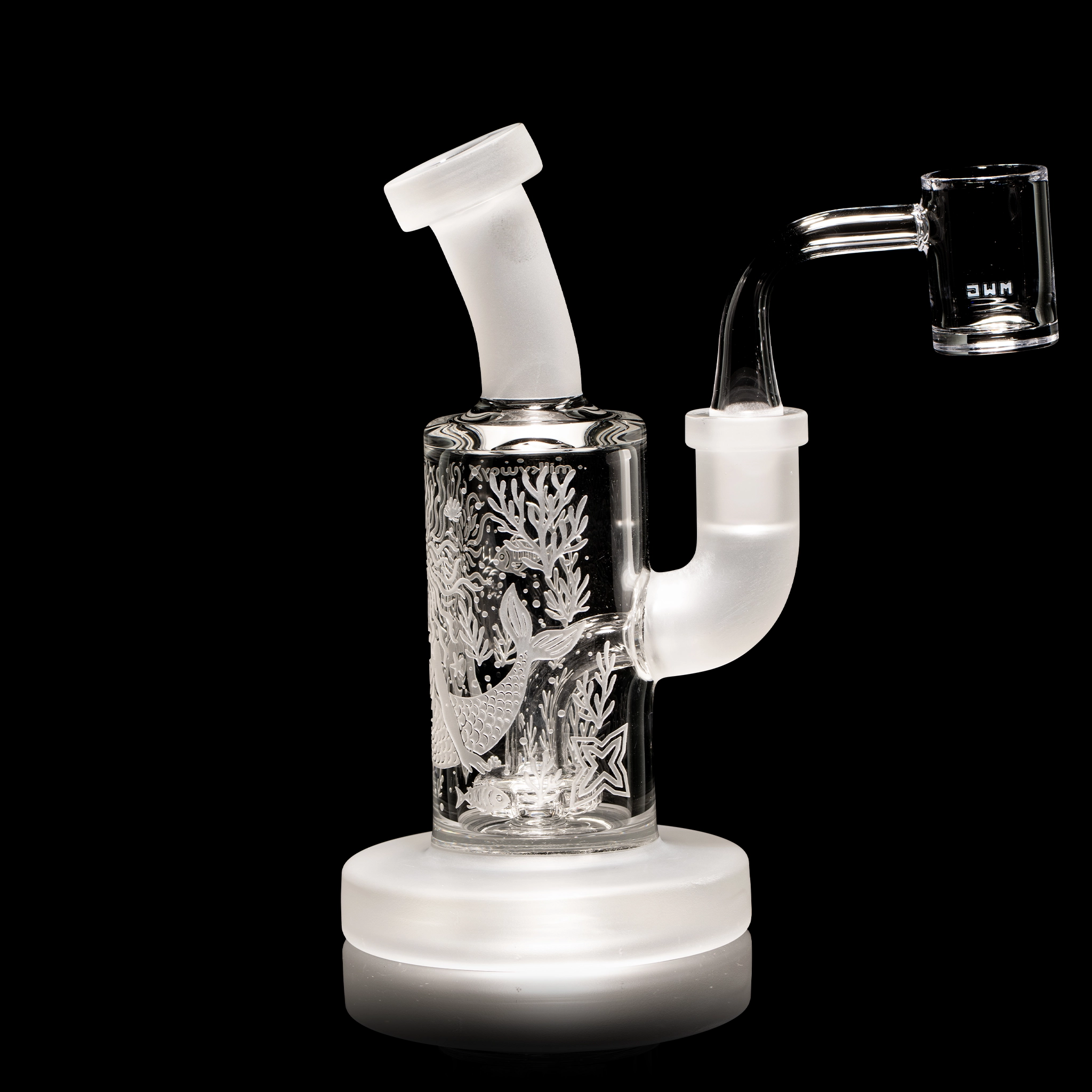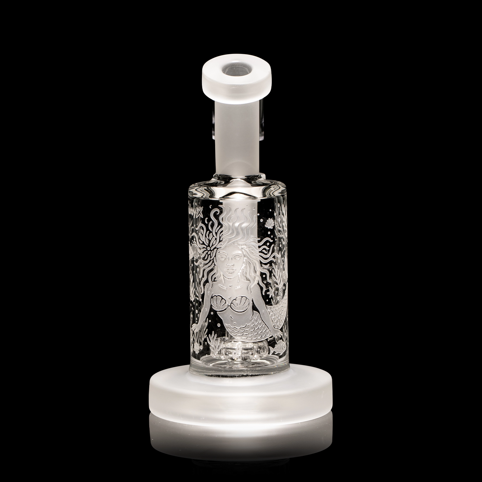 A compact 6” rig featuring a single-layer sandblast of a deep sea mermaid. The design flows with underwater elegance while the thick glass body gives it a sturdy, durable feel. Contains a mini pirelli perc for perfect for smooth, flavorful hits. Comes with a quartz banger nail.