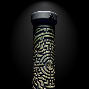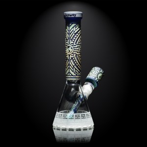 This 11″ mini beaker is colored glass layer with glass frit and sandblasted deep! It comes with a matching bowl and downstem.