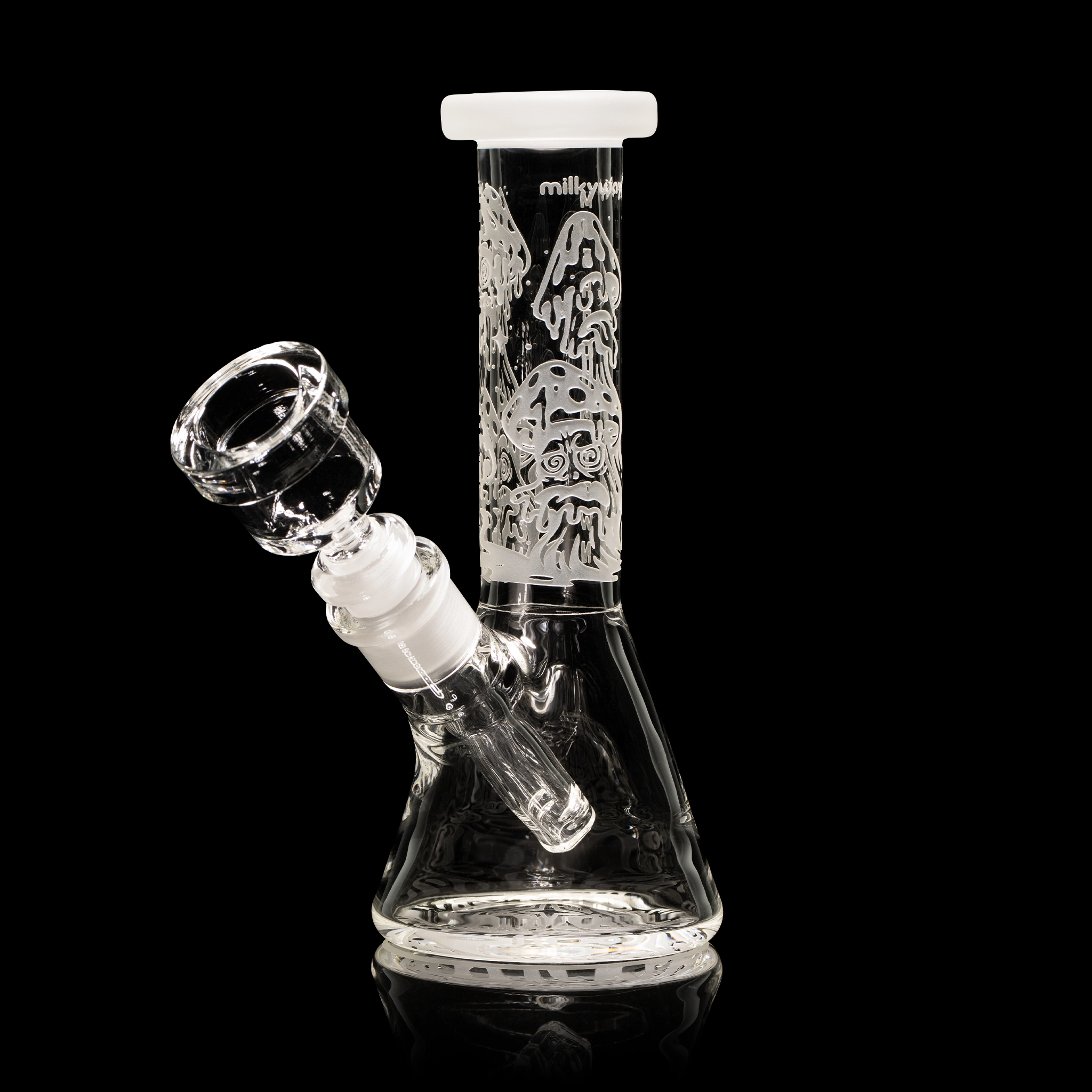 This 6” mini beaker features a single-layer sandblast of classic psychedelic mushrooms in melty, dreamlike forms. Small and portable, but made with the same thick glass as our larger pieces. Comes with bowl and downstem.