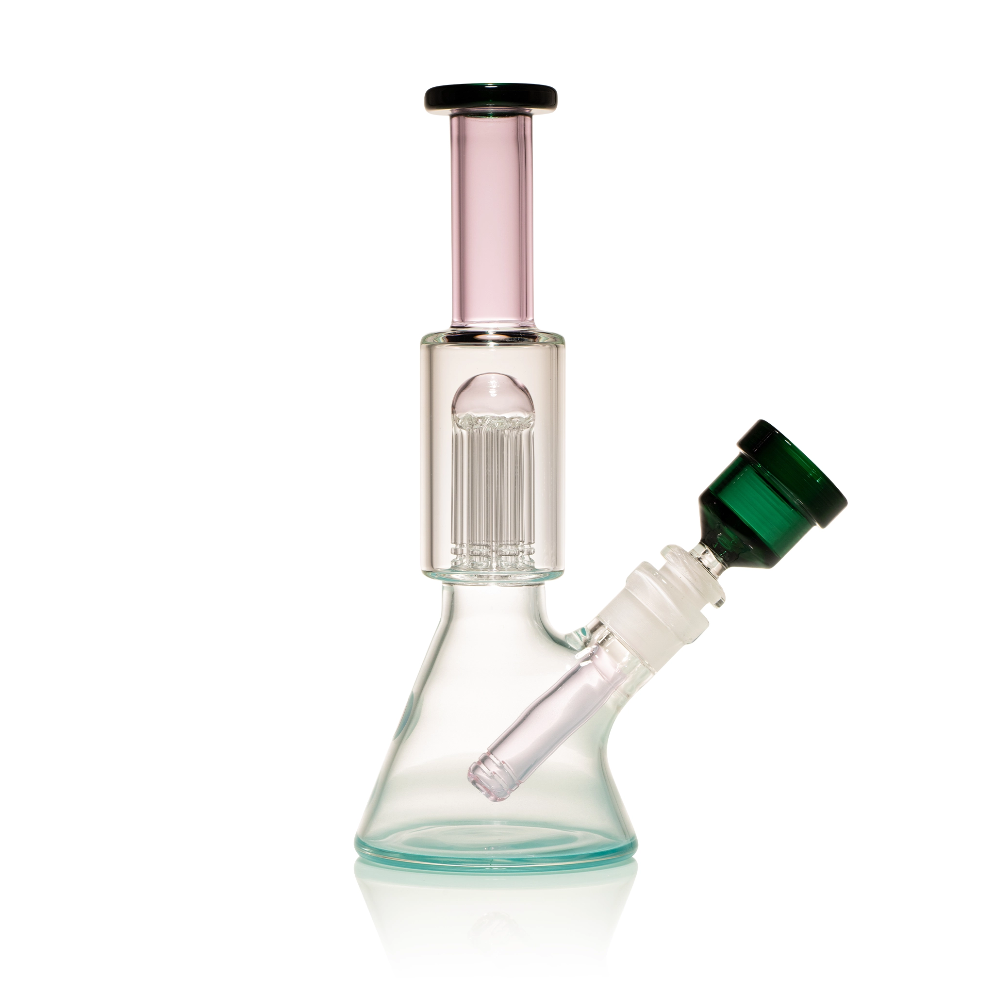 This elegant 9” beaker showcases a perfectly balanced design, highlighted by complementary colored glass sections that create a bold yet harmonious visual statement.