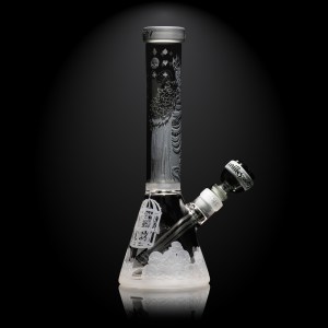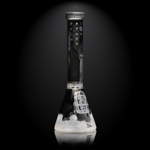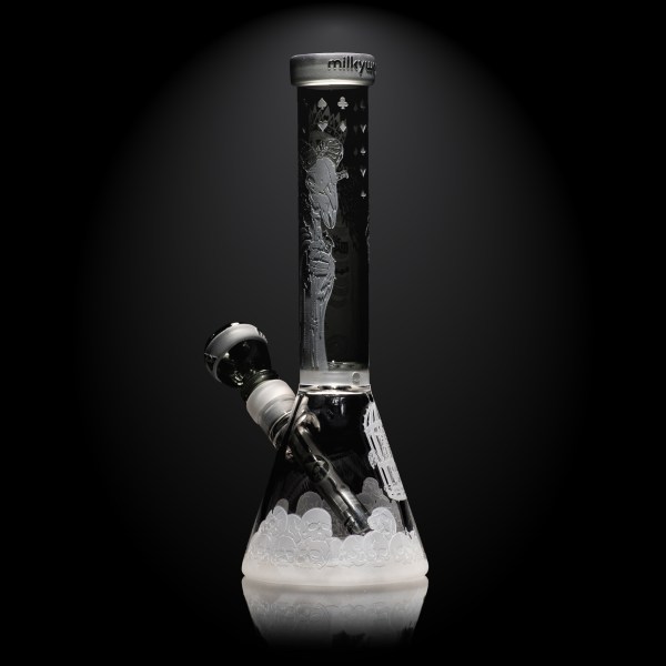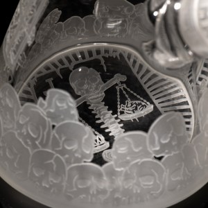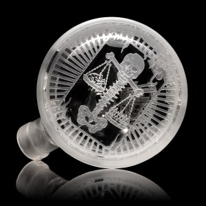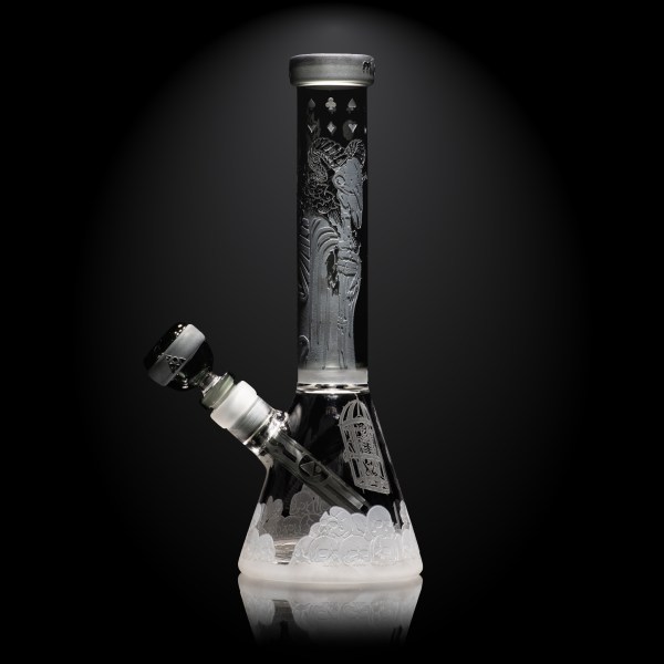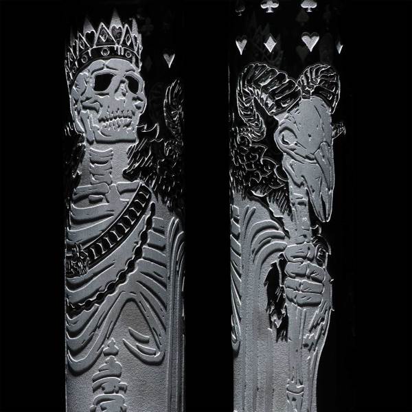 We used our highest level technique ‘Micro-SB’ to produce this beaker, making it one of our most detailed and intricate pieces. Inspired by games of chance and tyrant kings, this 11” mini beaker continues the card game between King Horan and Death. This special edition depicts the ceremony legitimizing his unholy anointment…