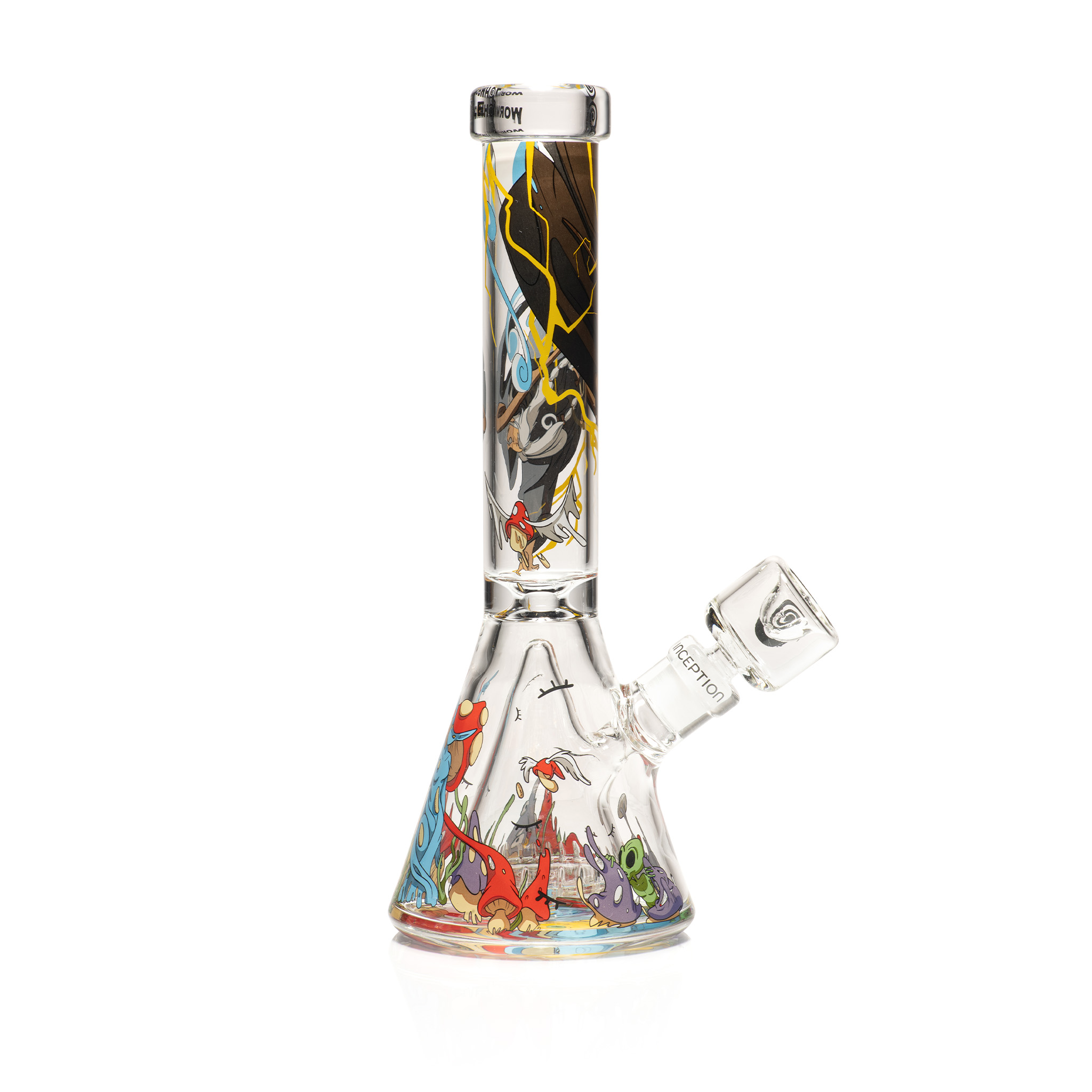 Inception tells the tale of how Fortinah, spawn of the Eldar Fungi came to be… This 10.5″ beaker contains a Collins perc that produces large stacks of bubbles! The perfect size for anyone who wants to use it as a rig as well as for flower.